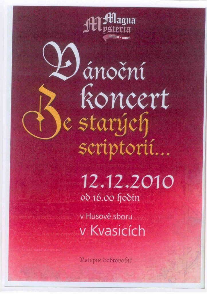 přidáno: 08.12.2010Církev československá husitská v Kvasicích Vás srdečně zve na vánoční koncert "Ze starých scriptorií..." v podání souboru Magma Mysteria, který se koná v neděli 12.prosince 2010 od 16.00 hodin v Husově sboru ve Kvasicích. Vstupné dobrovolné.