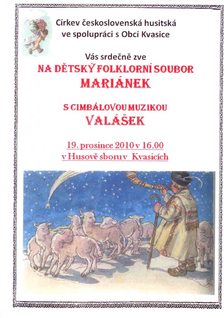 přidáno: 13.12.2010Církev československá husitská ve spolupráci s Obcí Kvasice Vás srdečně zve na dětský folklorní soubor Mariánek s cimbálovou muzikou Valášek. Vystoupení se koná v neděli 19.prosince 2010 v 16.00 hod. v Husově sboru v Kvasicích.