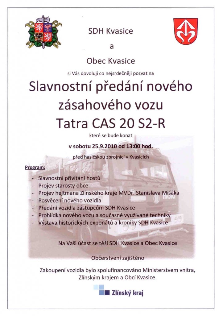 přidáno: 13.09.2010SDH Kvasice a Obec Kvasice Vás zvou na slavnostní předání nového zásahového vozu Tatra CAS 20 S2-R, které se uskuteční v sobotu 25.září 2010 od 13 hodin před hasičskou zbrojnicí.
