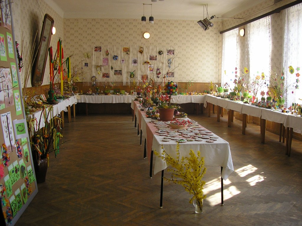 Další část velikonoční výstavy již byla prodejní. Zde si mohli návštěvníci prohlédnout výrobu nejrůznějších druhů kraslic, dekorativních předmětů ze šustí, pedigu, zdobení perníčků a jiných velikonočních dekorací. Tyto výrobky bylo možno si i zakoupit a ti nejzručnější si mohli sami zkusit vyrobit vlastní velikonoční kraslici nebo jinou dekoraci. Kluci měli možnost naučit se uplést tatar nebo alespoň pozorně shlédnout, jak se tatary pletou.